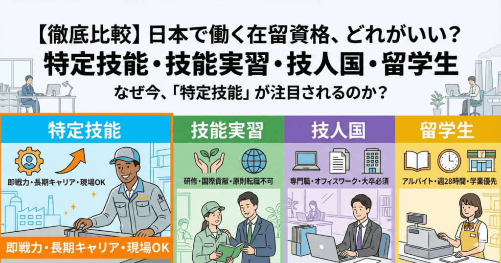 【徹底比較】日本で働くための在留資格どれがいい?「特定技能・技能実習・技人国・留学生」の違いを解説
