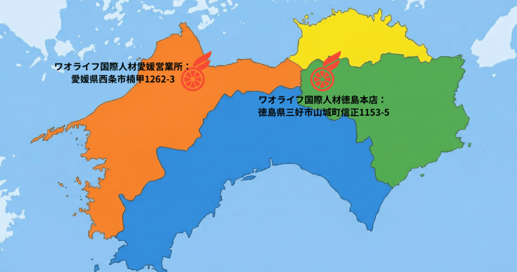 ワオライフ国際人材は、徳島県三好市の本社と愛媛営業所の2拠点を軸に、四国4県(徳島・愛媛・香川・高知)全域を網羅する強力なサポート体制を整えています。「四国のへそ」と呼ばれる三好市と、産業の要所である愛媛に拠点を置くことで、各県への迅速な訪問と密着した支援を実現しました。