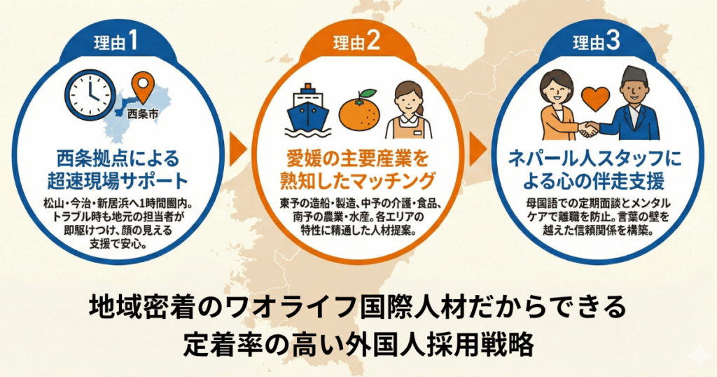 また、愛媛営業所がある西条市や隣接する今治市の基幹産業である製造業・造船業においても、若手人材の不足による技術継承の危機を、多くの経営者様が抱いています。ワオライフは、この数字の裏にある現場の切実な焦燥感に寄り添います。特定技能人材の受け入れは、単なる欠員補充ではなく、愛媛の産業と地域の未来を維持するための「不可欠な経営戦略」です。地元密着の私たちが、最新のデータと地域の雇用情勢に基づき、貴社に伴走します。