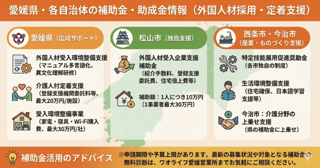 松山市内に事業所を置く中小企業を対象に、特定技能などの在留資格を持つ外国人を紹介業者を通じて雇用した際の手数料や、住宅の借り上げ費用の一部を補助する制度があります。 (例:松山市外国人材雇用支援補助金)