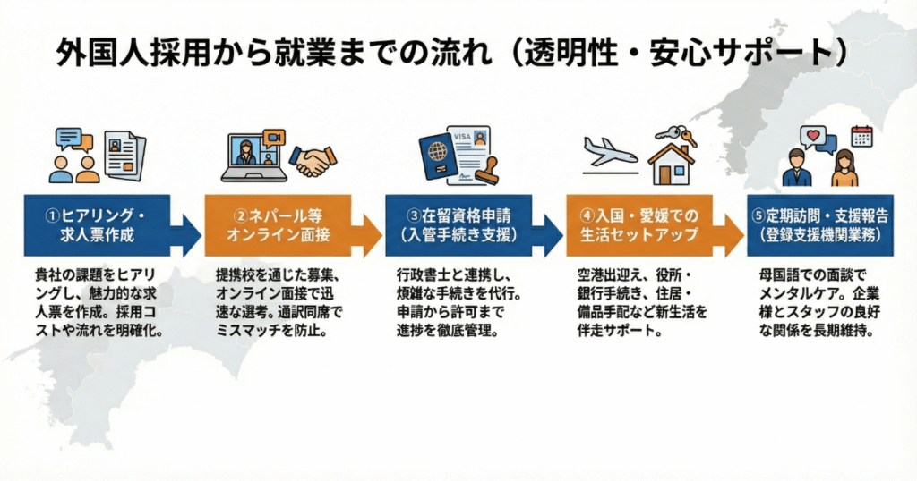 外国人採用は「入れた後」が本番です。トラブル時にすぐ来ない遠方の会社ではなく、地元の事情を熟知したワオライフ愛媛営業所にお任せください。制度の仕組みから、補助金の活用、ネパール人スタッフの定着支援まで、まずは無料でご相談を承ります。