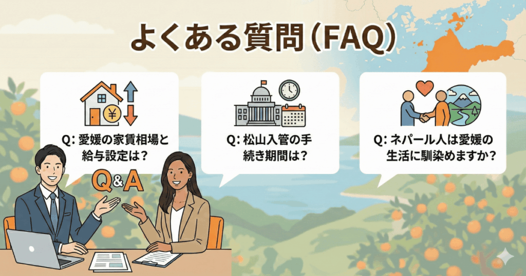 A: 特定技能人材の給与は「日本人と同等以上」が原則ですが、手取り額が少なすぎると離職の原因になります。愛媛県(松山市・西条市等)の家賃相場は3万円〜5万円程度と都市部より低めです。入居費用や家賃の一部を企業様が補助することで、スタッフの生活が安定し、定着率が大幅に向上します。地域の最低賃金や同業他社の事例に基づいた、最適な給与シミュレーションを弊社で提示可能です。